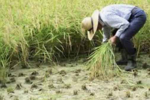 鎌を手に田に入る。