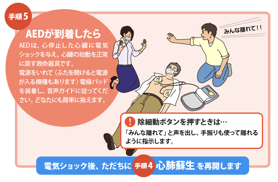 5. AEDの指示に従い、ショック後すぐ胸骨圧迫を再開。