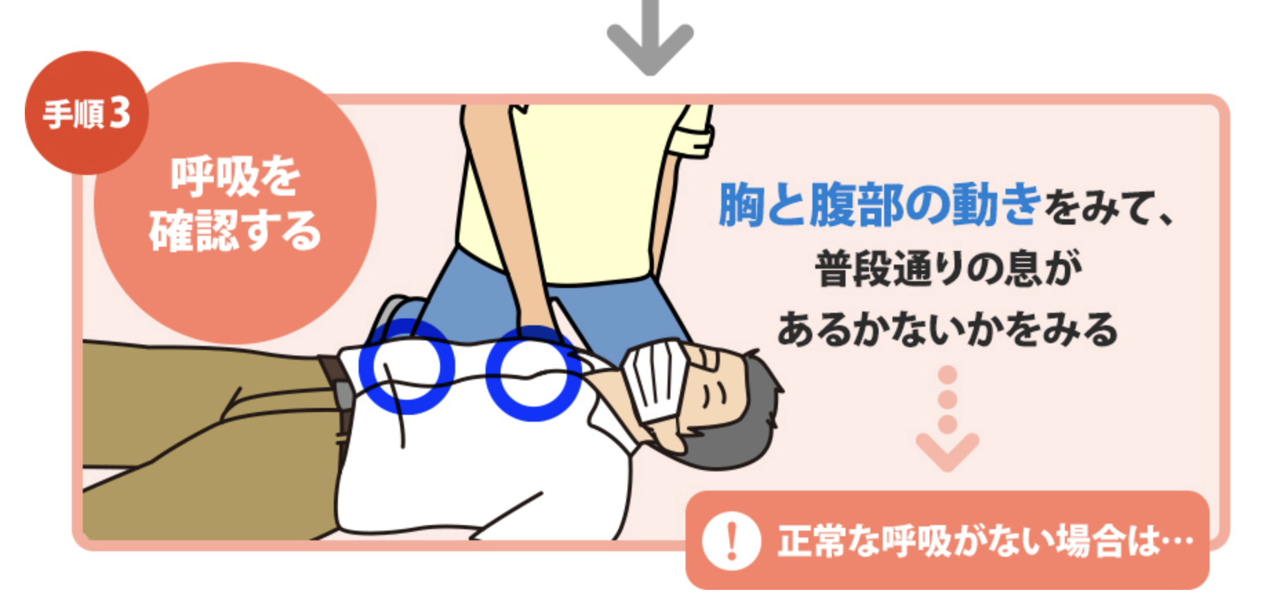 胸とお腹の動きをみて、