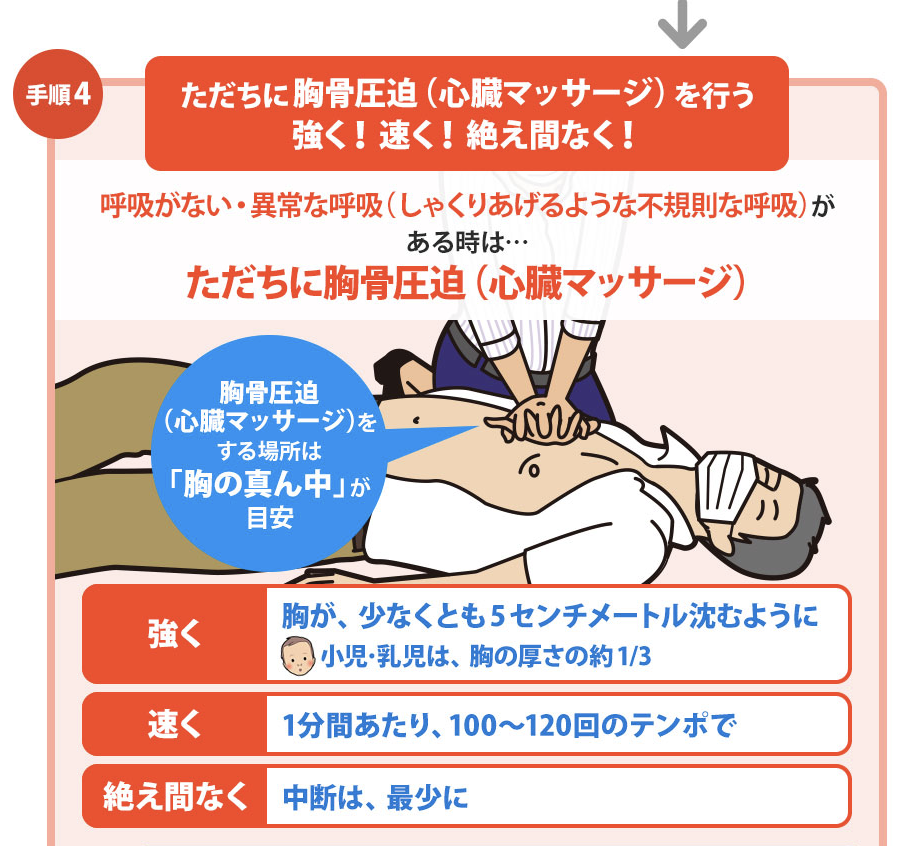 呼吸が無い場合や途切れ途切れの場合は